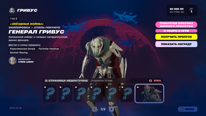 В 1 мини-сезоне 6 главы секретным скином стал Генерал Гривус. Датамайнеры предполагали, что он попадет в LEGO-пропуск, но разработчики решили иначе. Генерал Гривус станет доступен для получения только с 15 мая.