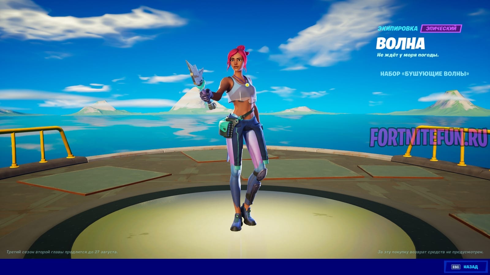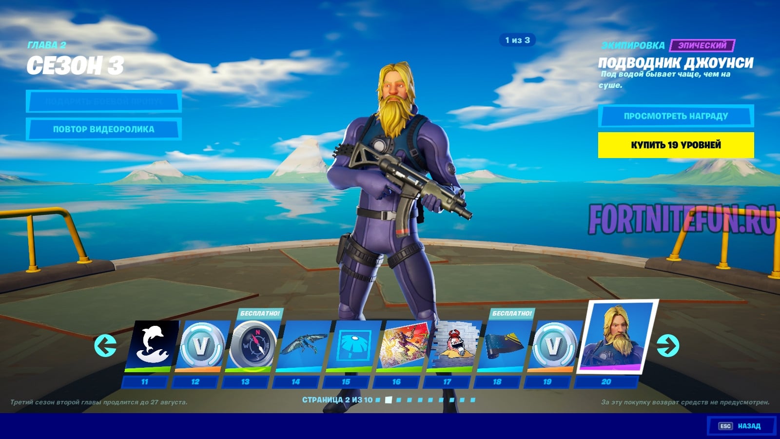 Водные экипировки на этом не закончились, ведь здесь нас встречает еще один свежедобавленный скин — «Подводник Джоунси». Ну а вокруг него экраны, в-баксы, граффити и дельтаплан. Для кого как, но в-баксы лично для меня на этой прокрутке куда приятнее, чем другие косметические предметы.