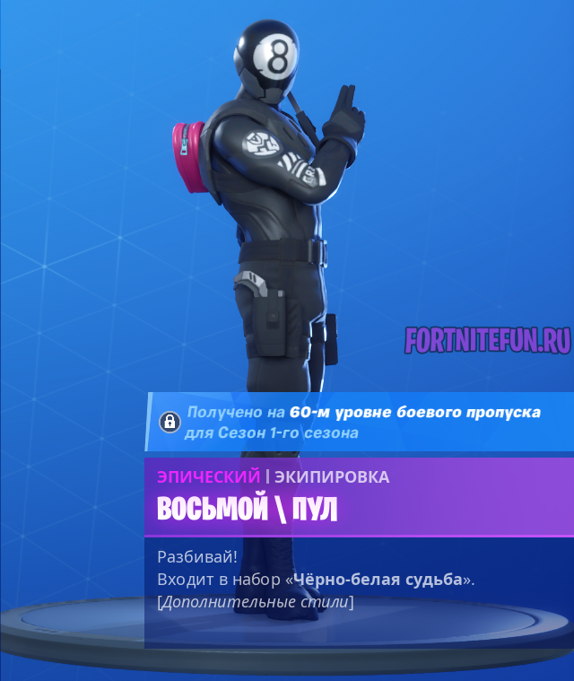 Экраны, обертка, граффити… И в этом сезоне 60 уровень отбивает все деньги, потраченные на боевой пропуск! Что за чудо?! На 60 уровне боевого пропуска можно найти скин Восьмой. Взбодритесь и узрите истинную мощь, заодно прихватив 100 В-баксов.