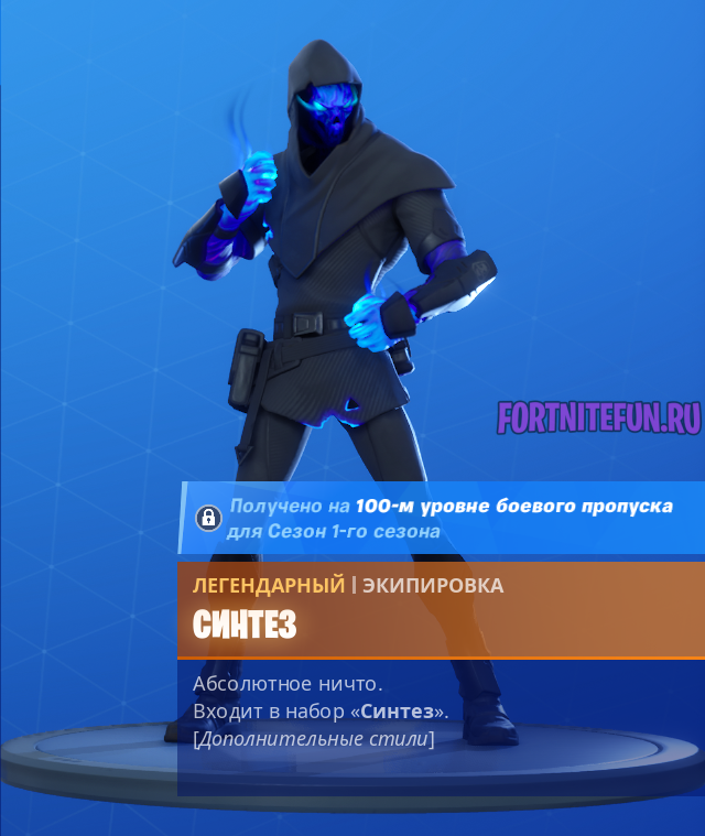 Ну а боремся мы во 2 главе 1 сезона ради главной награды — скина Синтез, который расположился на 100 уровне! Располагает он тремя стилями и цветами.