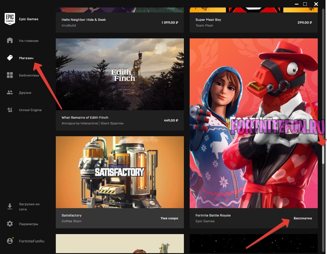 6. После входа в свой аккаунт нажмите с правой стороны на пункт «Магазин» и пролистывайте список игр, пока не найдёте фортнайт (увы в магазине Epic Store нет поиска).