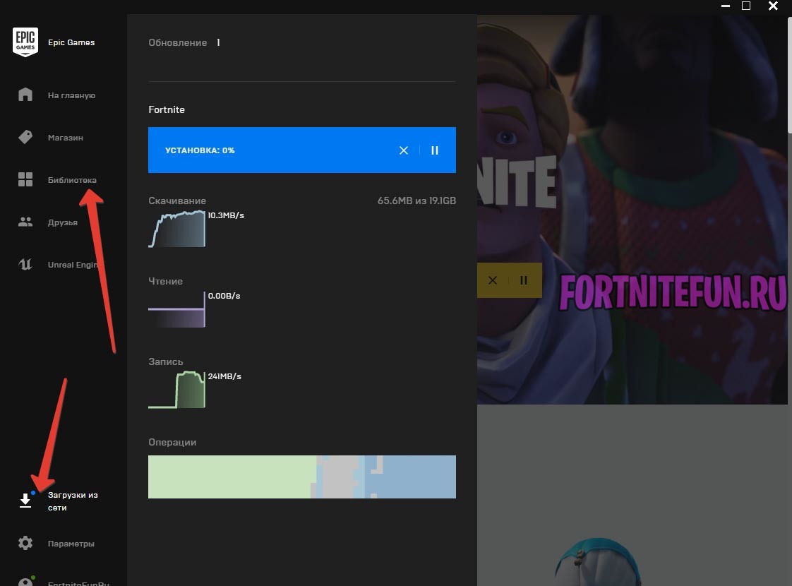 9. Скачивание фортнайт началось, остаётся только дождаться скачки и установки игры. Прогресс загрузки можно наблюдать кликнув по кнопке «Загрузка из сети», а по окончанию установки вы сможете запустить игру из вкладки библиотека. (Обе кнопки находятся слевой стороны окна игрового клиента Epic Store).