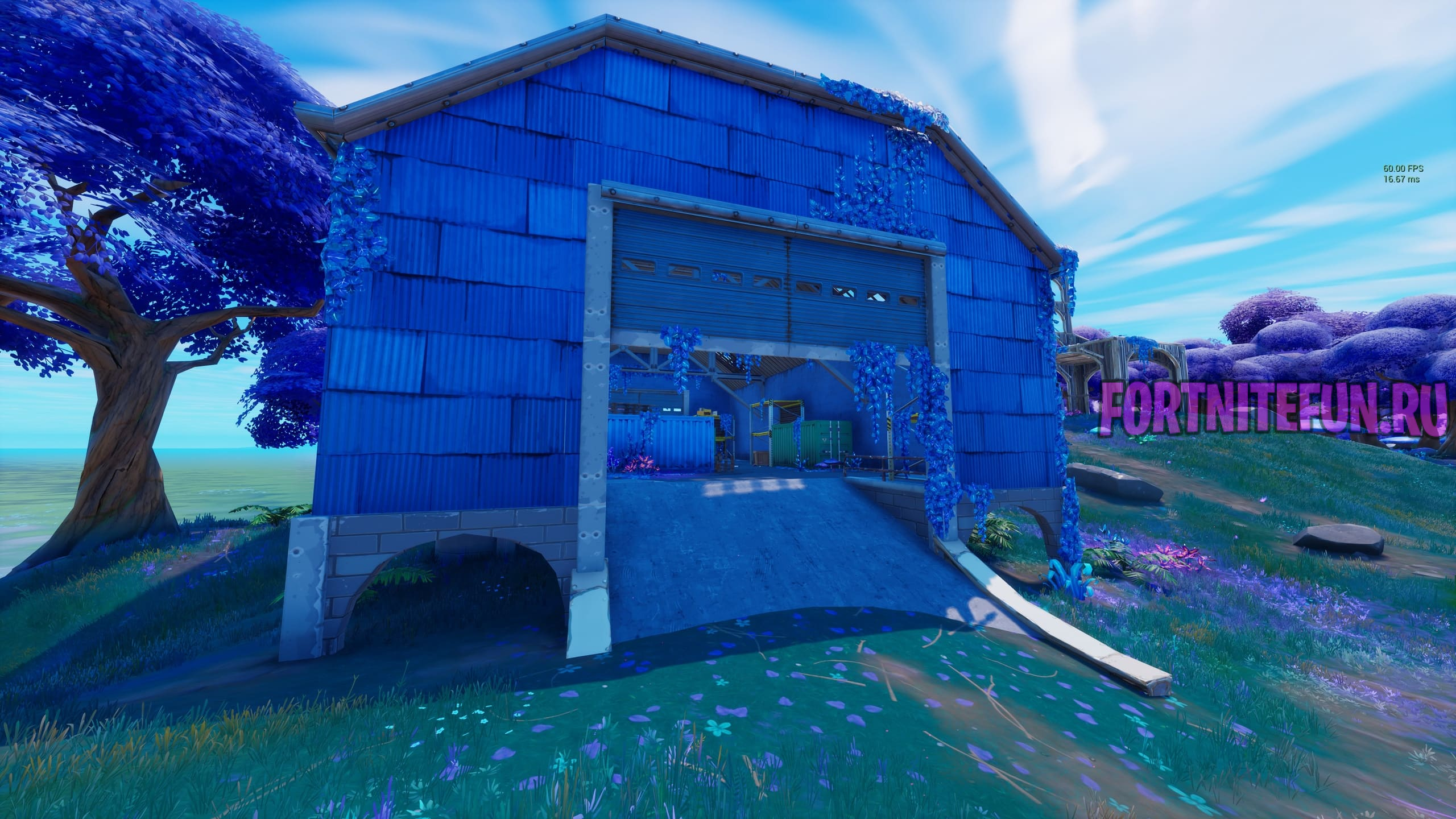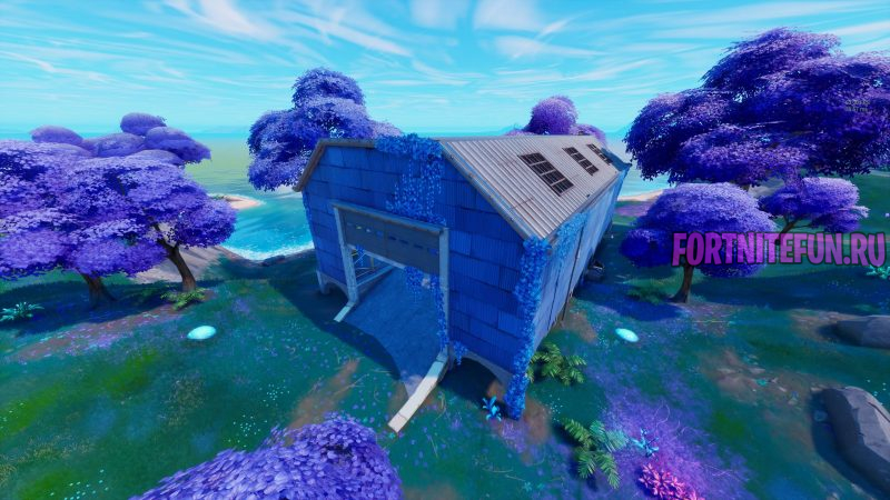 Акулу, Склад и стул окутывает некий голубой плющ, из-за которого возникает ощущение, что эти строения здесь уже давно.