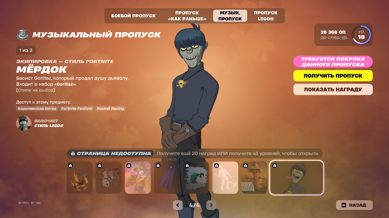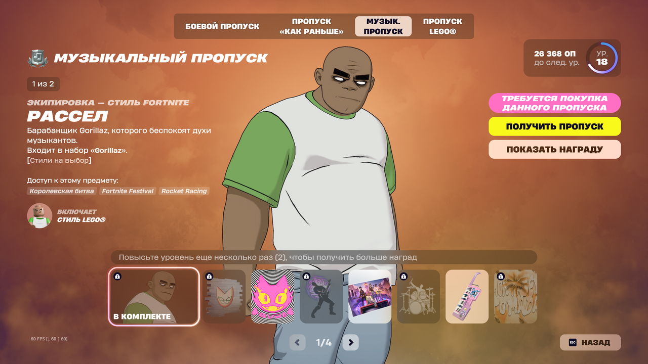 В музыкальный пропуск 10 сезона входят два скина: Russel Hobbs и Murdoc, крутые музыкальные инструменты, эмоции и целая пачка джем-треков. Стоимость пропуска составит 1400 В-Баксов, если не брать подписку Отряда фортнайт.