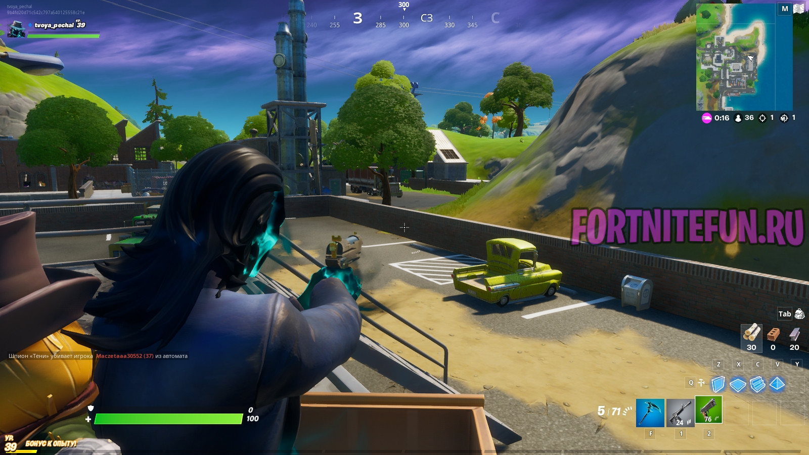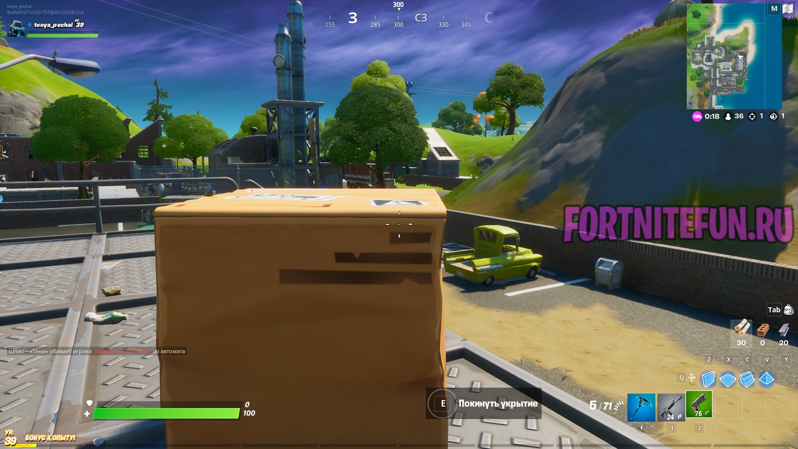 Фортнайт всегда приветствовал спорт, но вот среди игрушек есть бутылка и баскетбольнй мяч, а футбольного мяча нет, однако эту неприятность исправляет футбольный мяч, который можно найти на локациях. Нам удалось найти 2 мяча, но если вы знаете ещё — обязательно сообщите об этом в комментариях — многим эта информация будет полезна. Итак, первый мяч можно найти на холме около фермы, он так высоко, что вы за 1 удар сможете пнуть его на 100 метров, а то и больше. Пинать можно в любую сторону, но я рекомендую сломать забор и пнуть подальше с горы, чтобы летел максимально далеко.