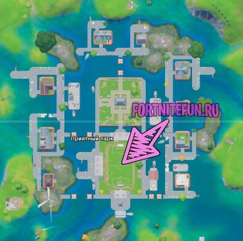 Приятный парк — давно существующая локация, в центре которой есть футбольное поле. В прошлом сезоне оно было изуродовано штабом шпионов, а в этом оно ничем не препятствует игре. Приземляйтесь на середину поля, толкайте персонажем мяч во вражеские ворота. Как только забьете один гол — выполните задание.