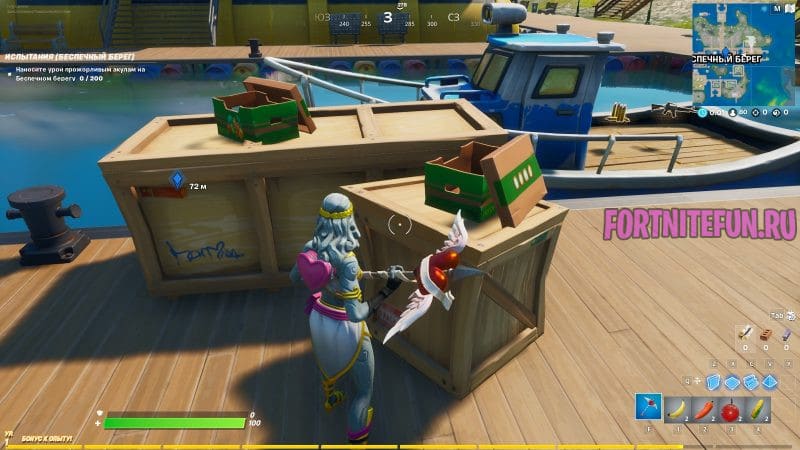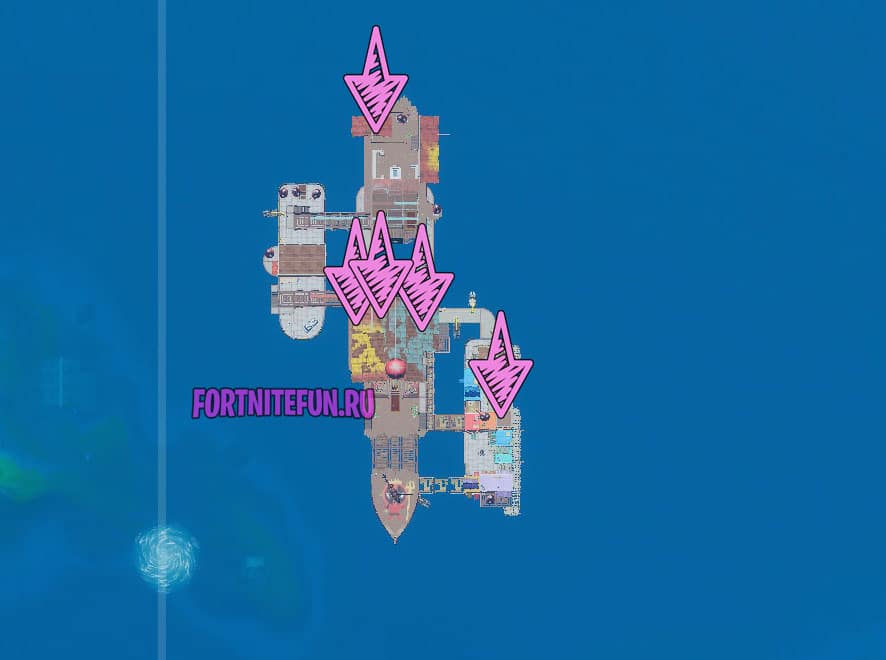 Плавучий штаб фортнайт — это новая область на карте, которую можно найти южнее Остролистных оград. В нее Вам и надо лететь, предварительно (или уже по местности) найти оружие и попадать в голову шпионам. Шпионы на этой территории находятся почти всегда на улице и редко заходят в дома. К справке: акула — не шпион.
