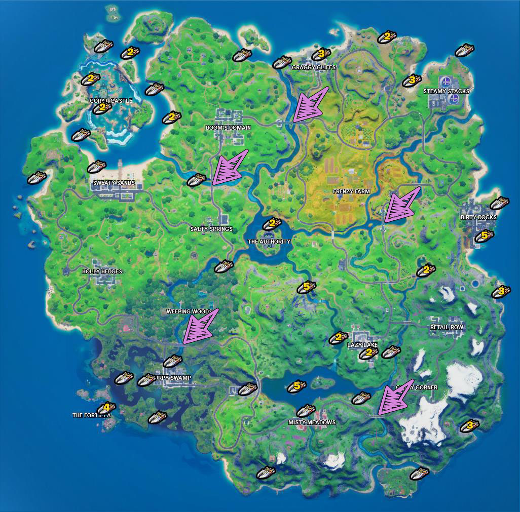 Колкие ключи — это самая старая и одна из самых известных локаций фортнайт. Сейчас она находится почти в центре карты, около администрации. Вам нужно приземлиться в данную локацию и собрать все сундуки. Мы уверены, что вы и без нас знаете каждый уголок колких, но на всякий случай добавляем карту. Как известно, с выходом 14 сезона сундуки не имеют 100% шанс спавна и в некоторых местах могут отсутствовать.