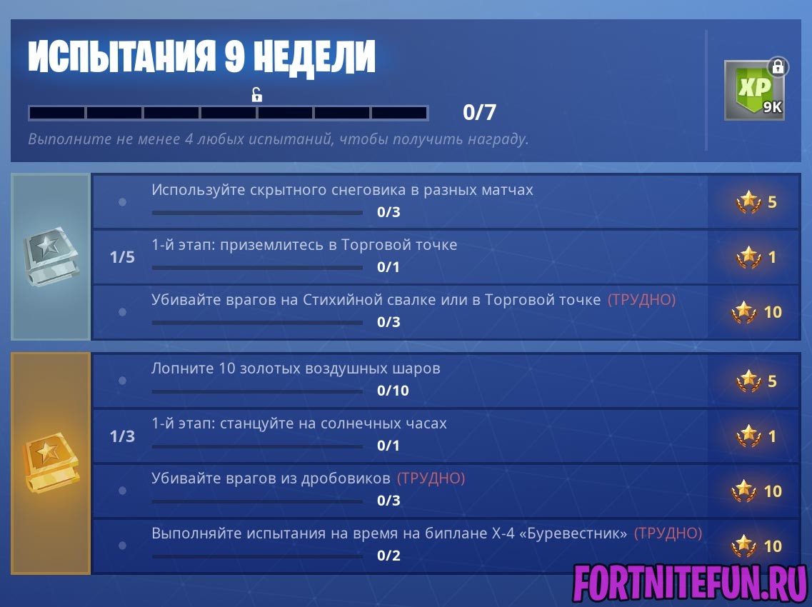 Задания 9-ой недели были довольно сложные, но у нас уже готово прохождение всех челленджей. Ознакомитесь с заданиями и переходите на страницу с прохождениями: 9 неделя фортнайт все челленджи.