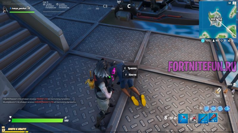 Трясти шпионов, как мы уже рассказывали — это новая функция фортнайт, которая ещё и позволит получить ачивку фортнайт. Просто найдите шпиона на одной из новых локаций, вырубите его, подойдите и нажмите «Е». Мы вытащим из врага важные данные, а задание будет зачтено.