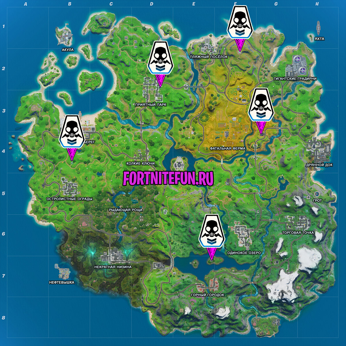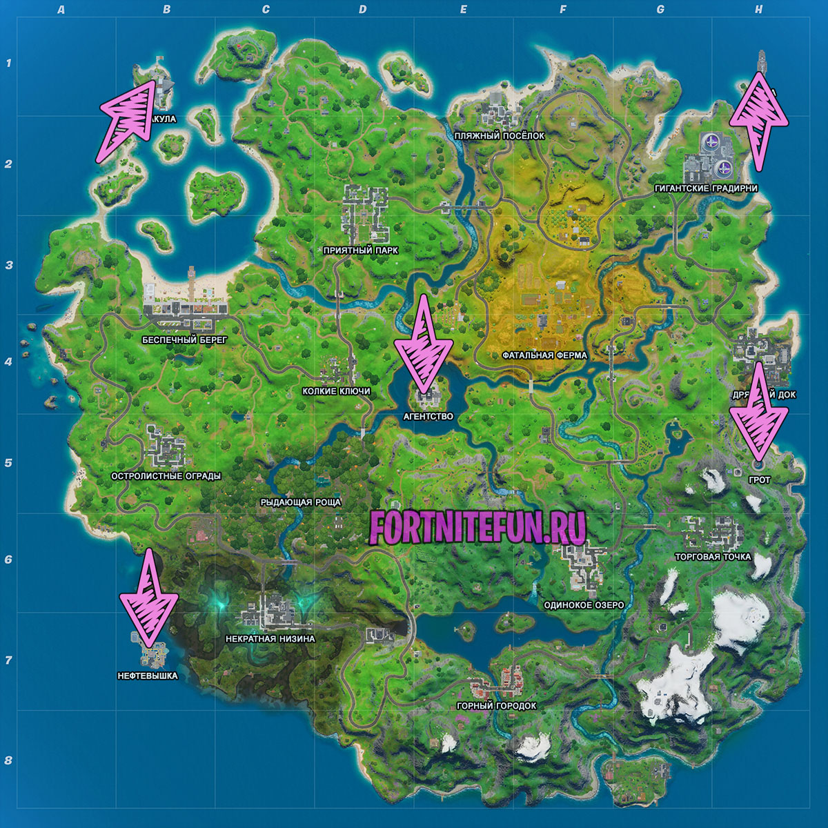 А последнее задание в данной серии испытаний закрепляет всё изученное за 2 сезон фортнайт, а точнее проверяет, все ли базы шпионов мы запомнили. На всякий случай ещё раз демонстрируем карту. Вам нужно прилететь в одну из этих точек и убить шпиона. Это абсолютно любой бот, который находится на базе. Главное помните, что нужно убивать шпионов на разных базах. Нужно посетить 3 базы и на каждой убить по одному агенту. Всё просто и уверена, что вы справитесь.