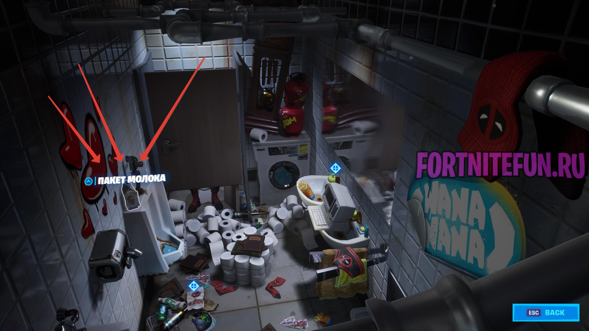 Принадлежащий Дэдпулу пакет молока находится нигде иначе как в его комнатке, которая, как мы знаем из первых испытаний, находится левее хранилища улучшений, в вентиляции. Вы заезжаете на дрифтах в его комнату, роетесь по округе и вуаля — пакет молока найден. Нажмите на него и он подберется. Сделайте все то, что мы сделали в видео и проблем не будет.