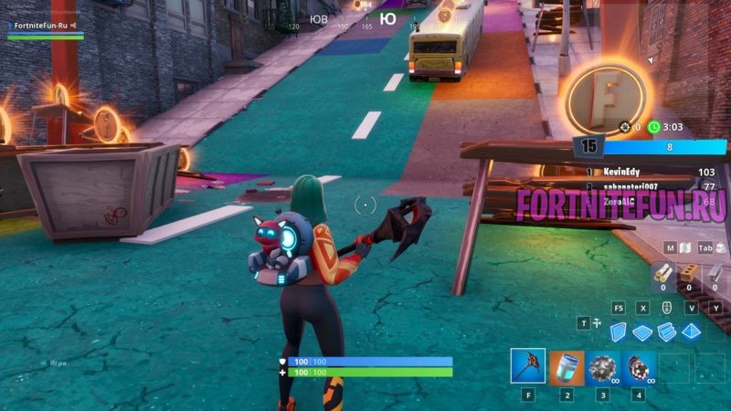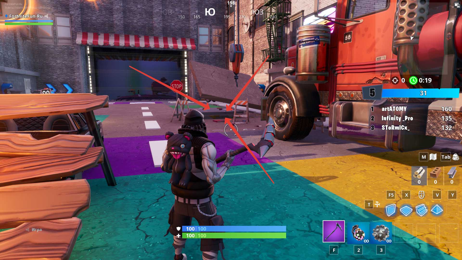 Сразу после начала матча двигайтесь по левой стороне и падайте в яму перед фургончиком. Внизу вы сможете подобрать обувь и достаточно монет. 2 предмета у нас уже есть. Как только выберетесь из туннеля, остановитесь и посмотрите на огромный щит над Вашей головой. На данном щите есть баскетбольный мяч. Встаньте под мяч и сдвиньтесь немного в сторону, киньте импульсную гранату под ноги и в момент её взрыва подпрыгните.