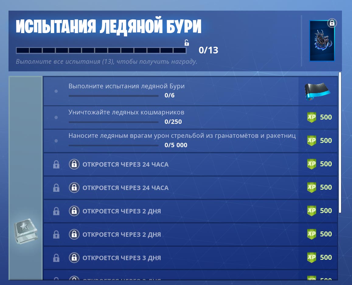 И снова наступили «захватывающие» душу челленджи! Ледяная буря — ивент, тип которого игроки уже видели в «14 дней Фортнайт«. Мы выполняем задания, нам начисляют награду — вроде с этим в прошлый раз разобрались. Сегодня, 19 января, от Epic вышел гибрид «Форнтайт кошмары» (глыбы, разукрашенные в фиолетовый мы уже видели!) и «14 дней» в другой стилизации — снежной.