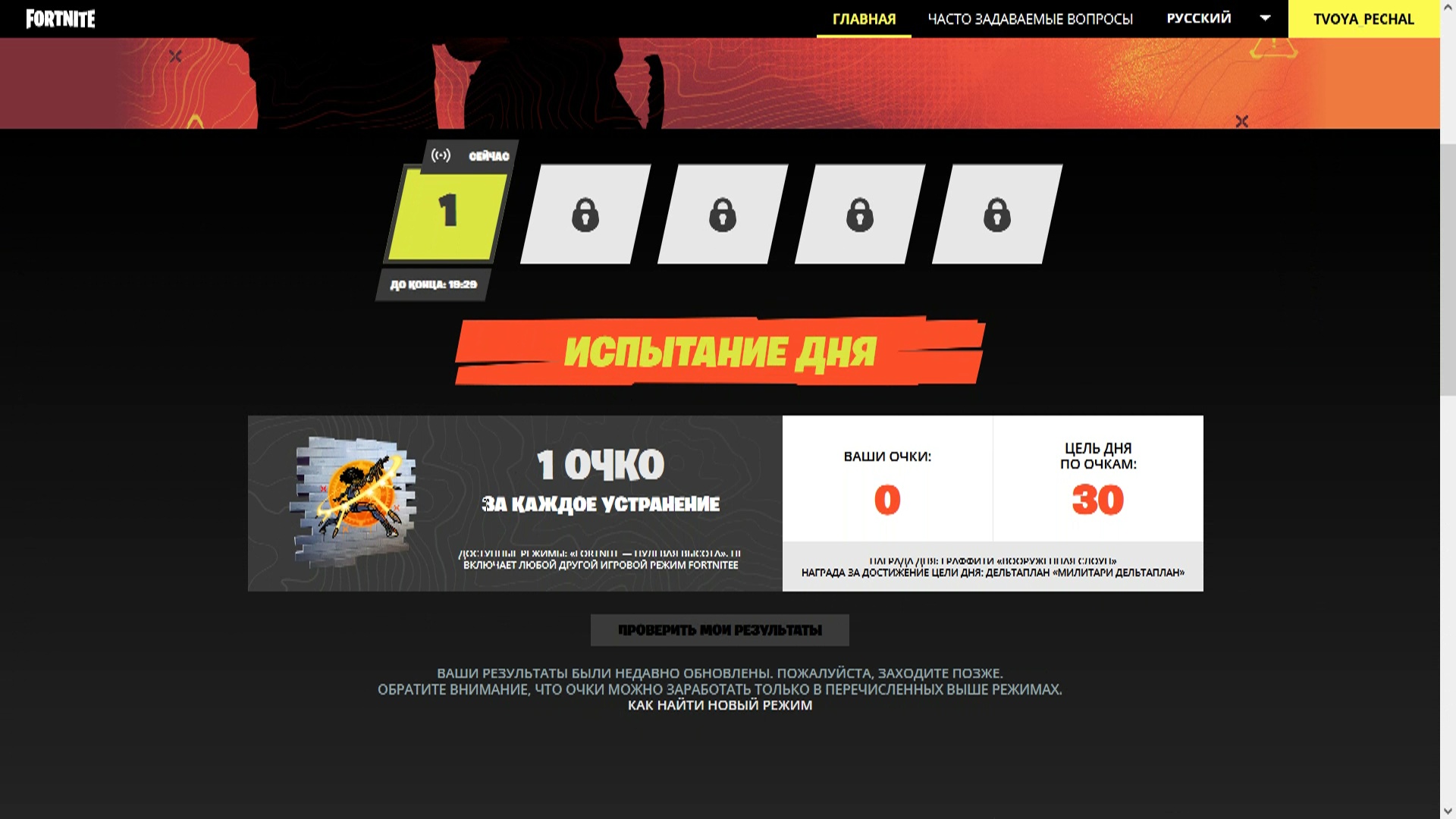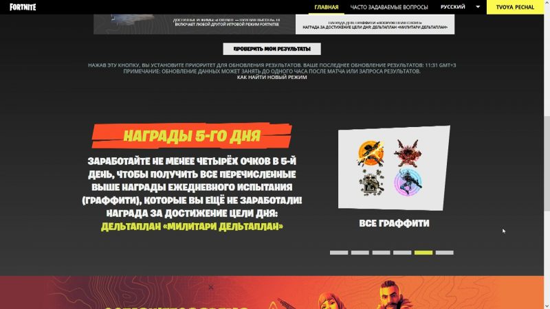 После входа в свою учетную запись вы увидите огромную полоску с тестом «Испытание дня». В первый день испытание дня подразумевает убийство игроков в режимах без строительства. И чтобы получить граффити, необходимо набрать одно очко. Так как одно очко дается за одно устранение, значит для получения граффити необходимо убить одного врага. Такая же система будет и в другие дни, правда испытания будут уже другие.