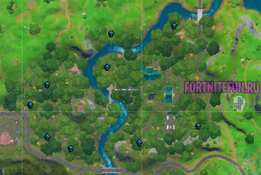 В Ревущей же роще можно найти только грибы. Они в свою очередь пополняют щит на 5 единиц, поэтому приходить на рощу с полной броней не стоит, а то станете посмешищем для пеньков. здесь Вы можете приземляться свободно в любую из точек, где есть грибы. 10 штук, если столько вы там найдете, как раз наполнят щит наполовину и с этим можно будет даже выйти из рощи живым.