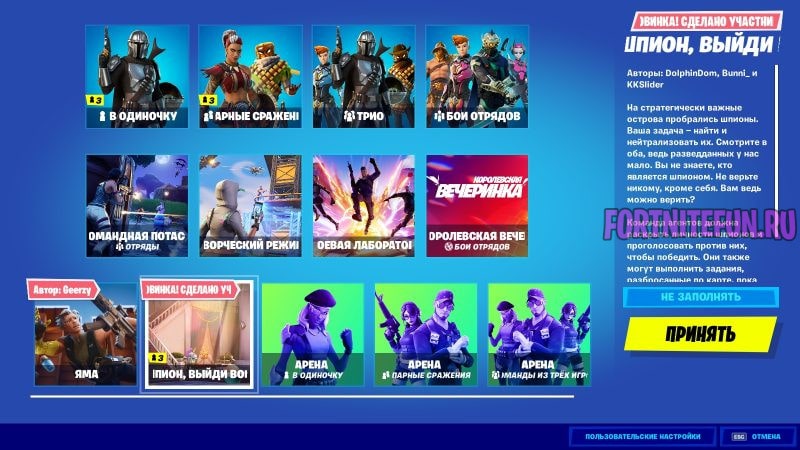 Чтобы выполнить данное испытание, откройте выбор режимов и тыкните на «Шпион, выйди вон». Далее начинайте игру и все матчи, что вы там сыграете, пойдут в копилку в выполнении данного испытания.