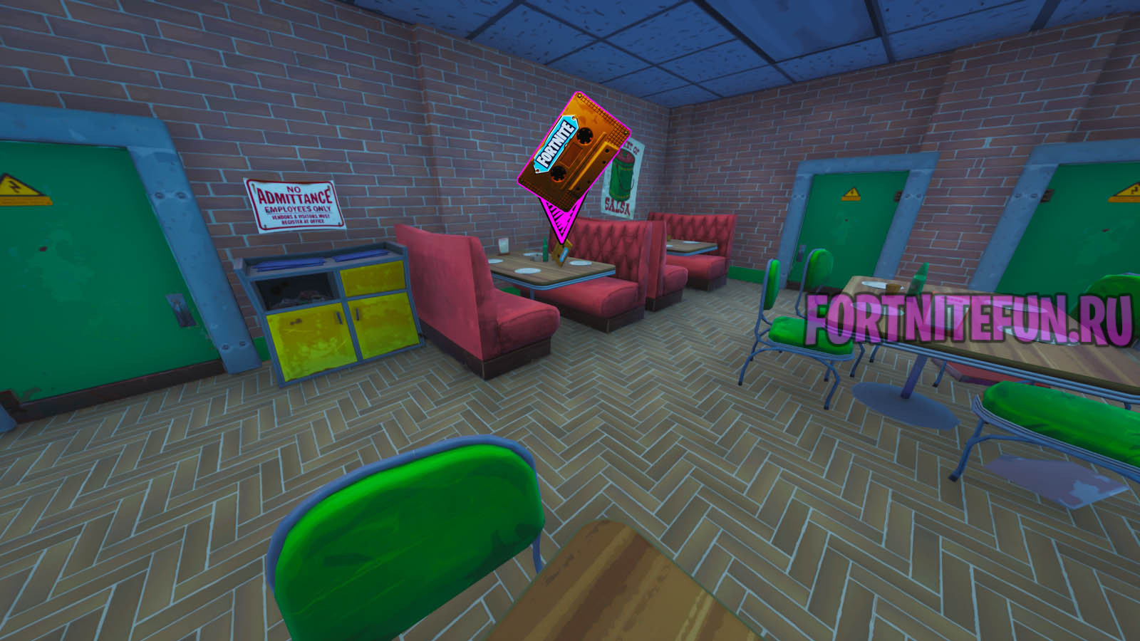 Найти записи пришельца в Засаленной закусочной можно непосредственно в кафе Тако. Заходите в него, перемещайтесь в самый конец и наблюдайте кассету прямо на столе! Воруйте запись и живите просто и без последствий! Применимо, конечно, только в пределах фортнайт.