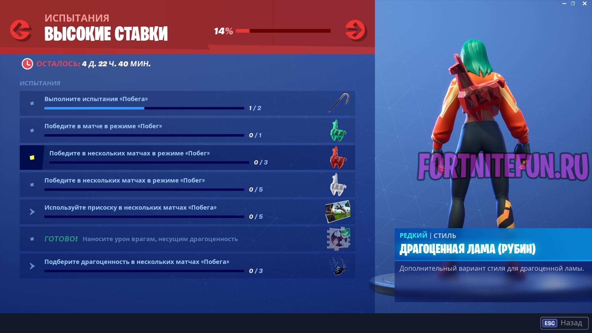 Спустя более чем полгода в фортнайт вернулся режим Побег, а вместе с ним и испытания «Высокие ставки». Режим побег — это уникальный режим фортнайт, в котором Вам необходимо взломать сейф, похитить из него драгоценную ламу и сбежать от преследователей. Своего рода ограбление по фортнайтовски, ну или микро PayDay в фортнайт.