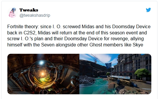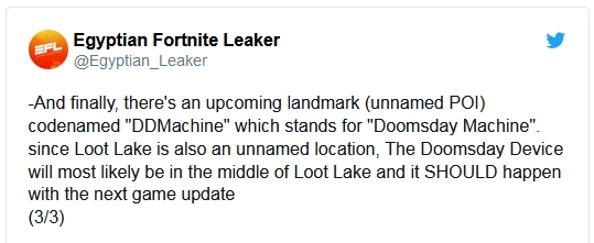 Интересно, что машина Судного дня во 2 сезоне 3 главы, равно как и во 2 сезоне 2 главы, будет питаться энергией из Подлого пруда. Есть подозрения, что новое устройство воспользуется водой из пруда, ведь в файлах есть спавны сундуков под водой, т.е. уровень воды будет уменьшаться. Кто знает, может мы и Мидаса увидим …