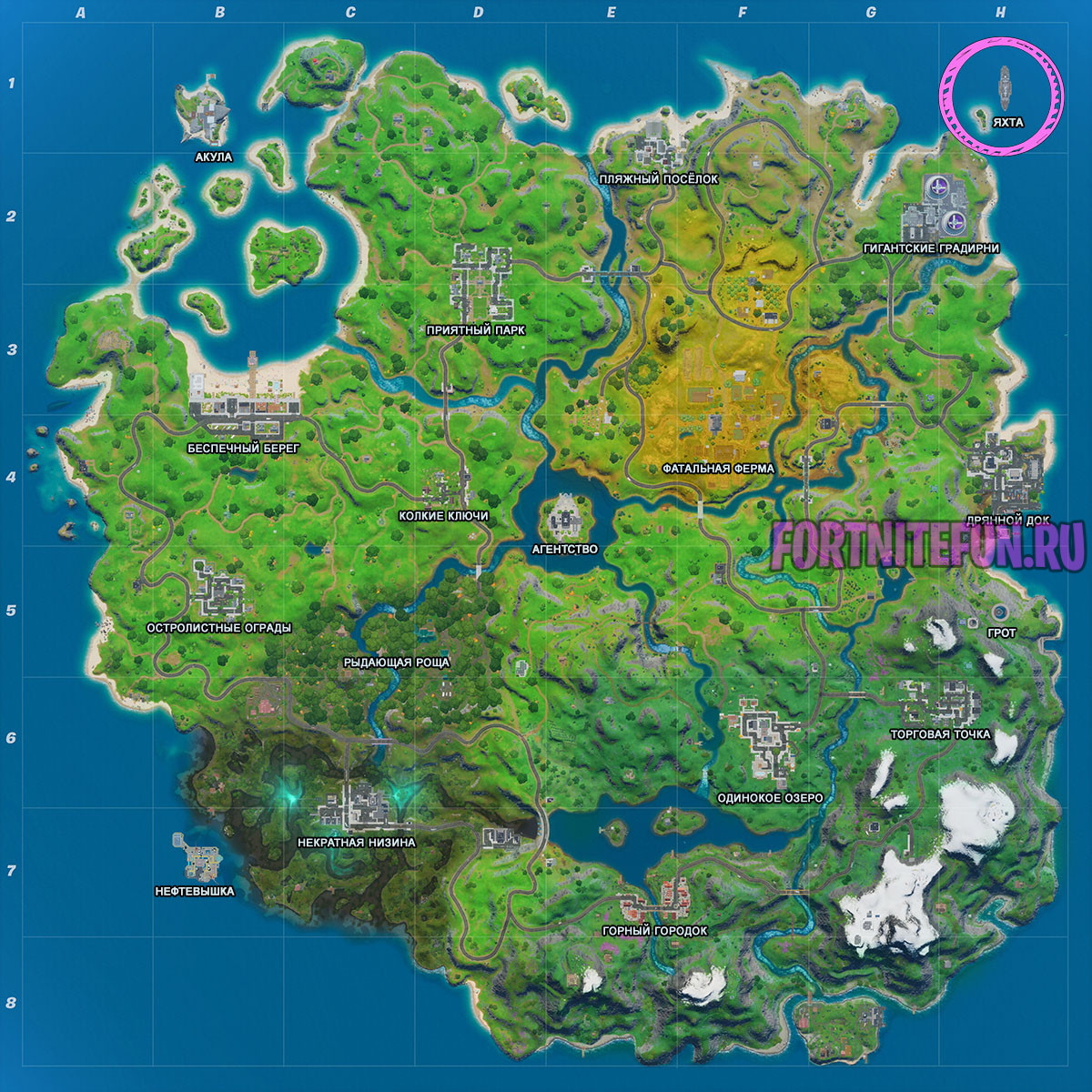 Яхта (The Yacht) — локация, добавленная на карту фортнайт после обновления 2 сезона 2 главы. Яхта находится неподалеку от Гигантских градирен в координатах H1. Эта самая северо-восточная именованная местность на карте.