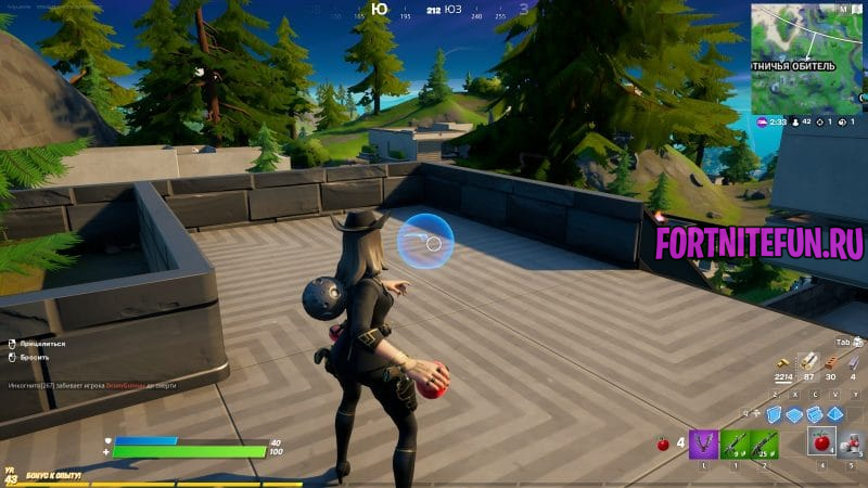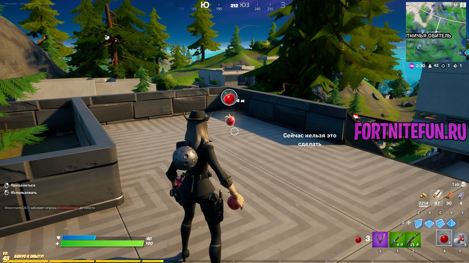 Далее выбирайте фрукты в инверторе, цельтесь в асфальт охотничьей обители и разбивайте их вдребезги (зажмите правую кнопку мыши для прицеливания и нажмите на левую, чтобы бросить)! Скажем нет витаминам!