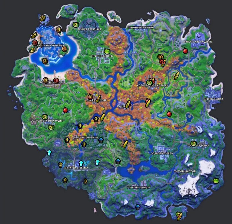 Собираемые предметы — это фрукты и овощи, которые находятся на карте фортнайт.