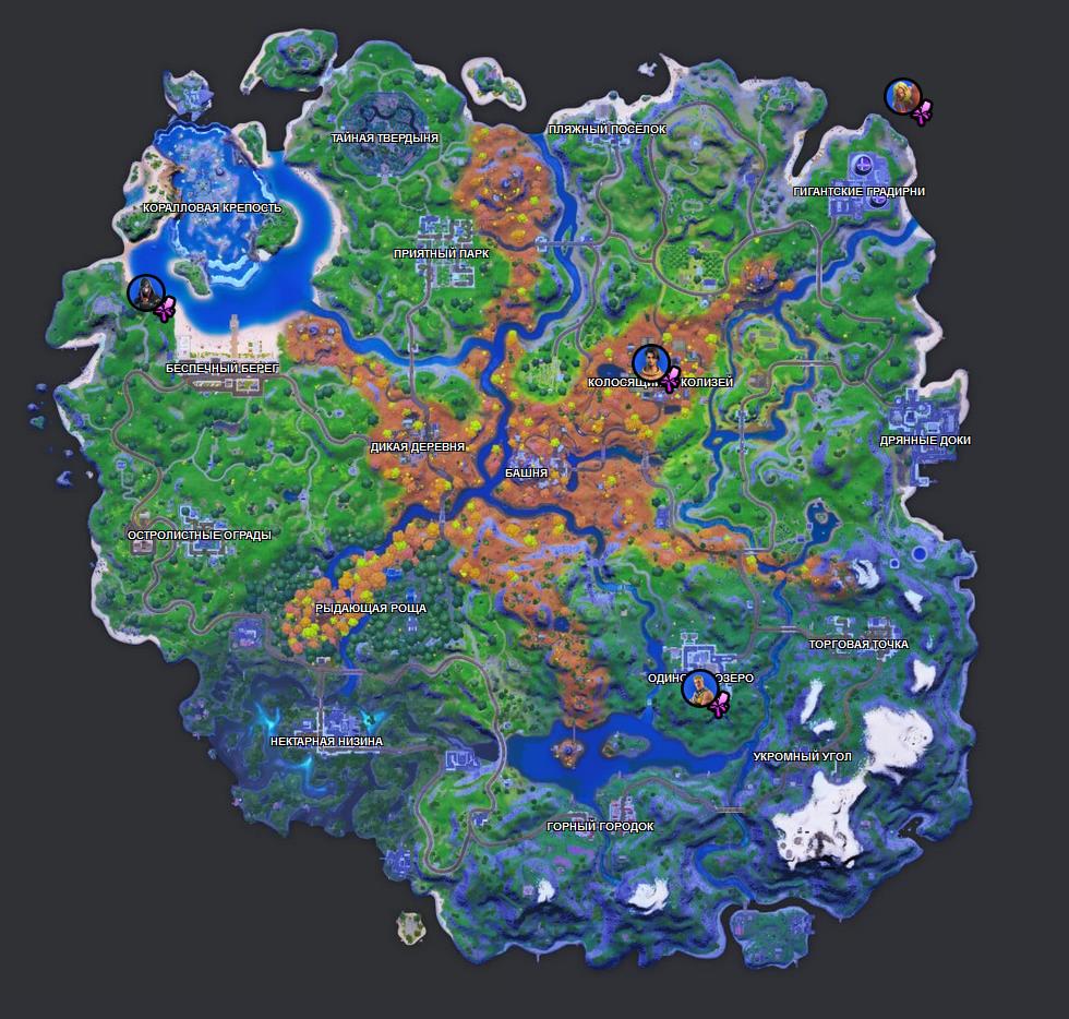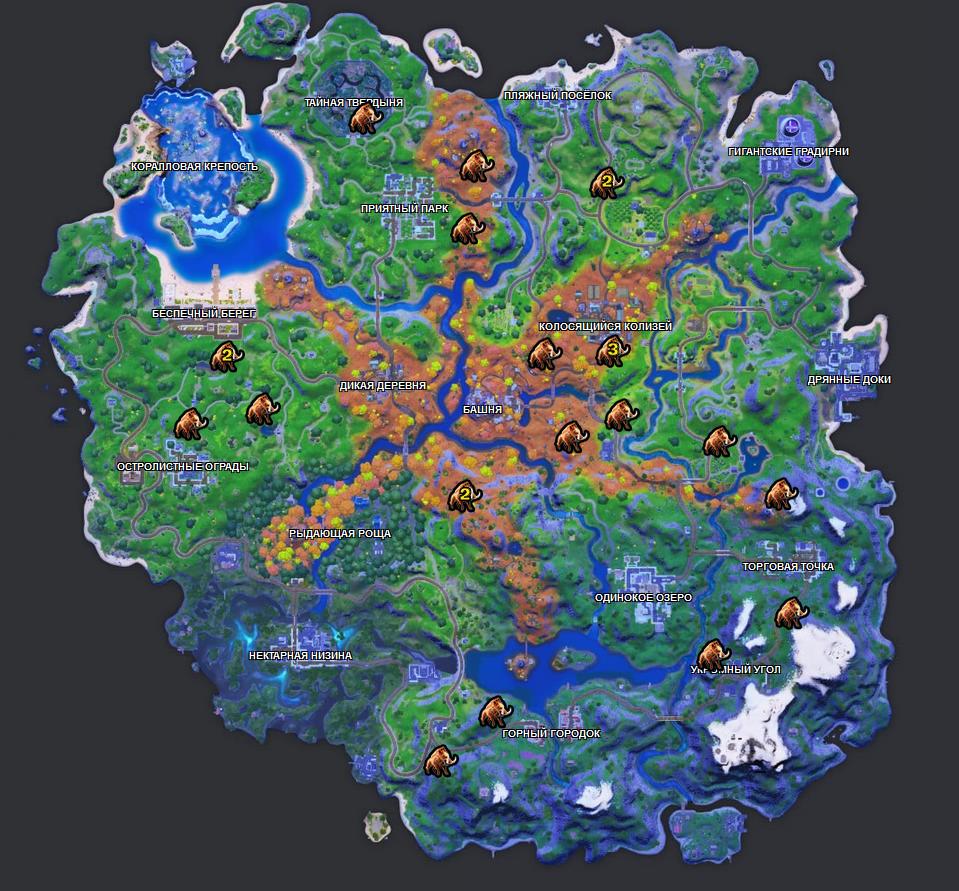 Охота — это то занятие, которое лежит в основе 16 сезона. На карте ниже вы можете увидеть места спавна кабанов. Но если вы не хотите надеяться на удачу — летите к локации Колосящийся колизей, там всегда есть кабаны в загоне. Вам останется лишь убить их, правда людей, которые также не захотят искать другие спавны будет довольно много.