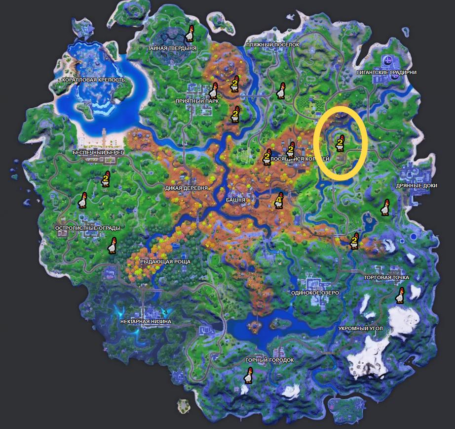 А вот карта мест, где вы можете найти куриц (кругом отмечена Стальная ферма):