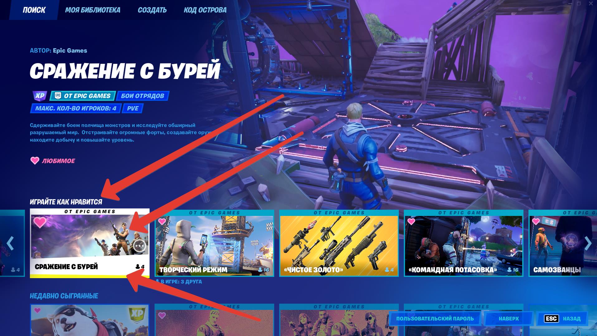 Для начала разберёмся где находится ПВЕ режим. Его можно запустить через меню выбора режимов. Он будет находиться в пункте «Играйте как нравится» с пометкой от Epic Games.