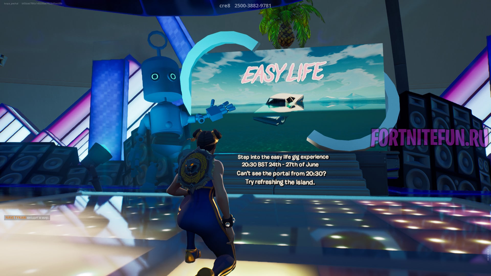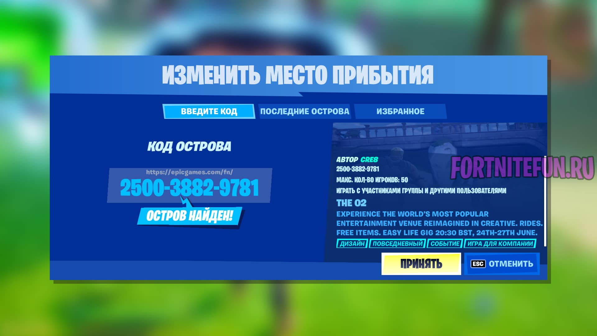 - Найти терминал для ввода номера острова, и ввести код острова с концертом: 2500-3882-9781 ИЛИ найти его в cписке рекомендуемых островов творческого режима (разработчики обещают, что остров появится в рекомендуемых островах).