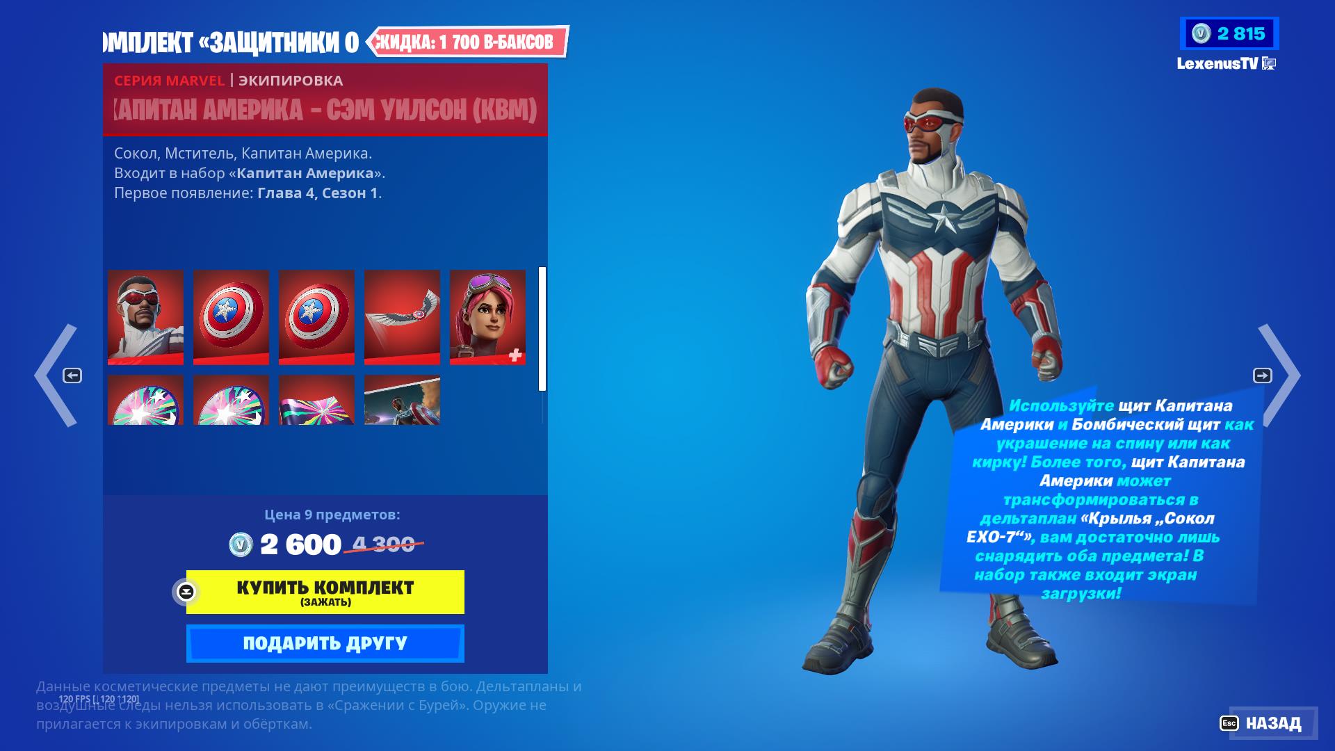 Цена набора составляет 2600 В-баксов, но каждый из скинов можно купить отдельно. Так скин Капитан Америка — Сэм Уилсон (КВM) обойдётся вам в 2000 В-баксов, а новая бомбистка в 1800 В-баксов.