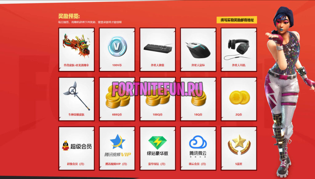Если верить гугл переводчику, то данные призы выдаются за вход в игру. Каждый пользователь, который зашёл в игру автоматически участвует в розыгрыше ценных призов. Также есть некоторая ветка заданий, за прохождение которых выдают внутриигровые предметы и В-баксы.