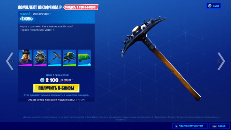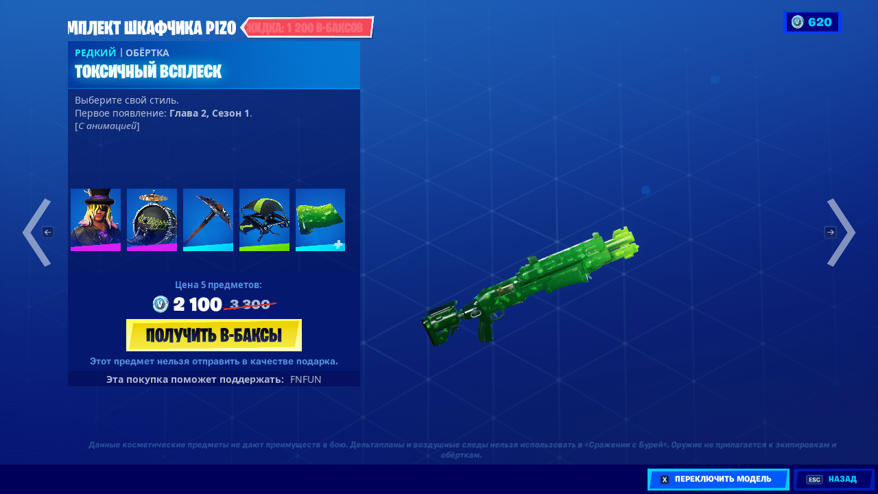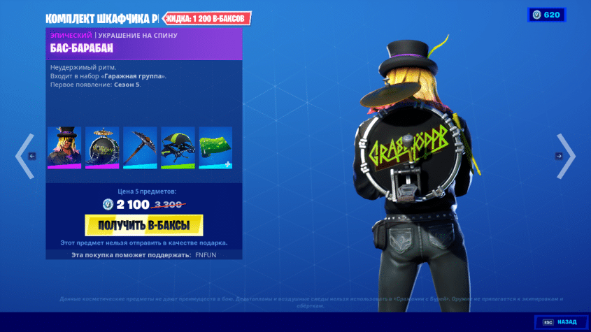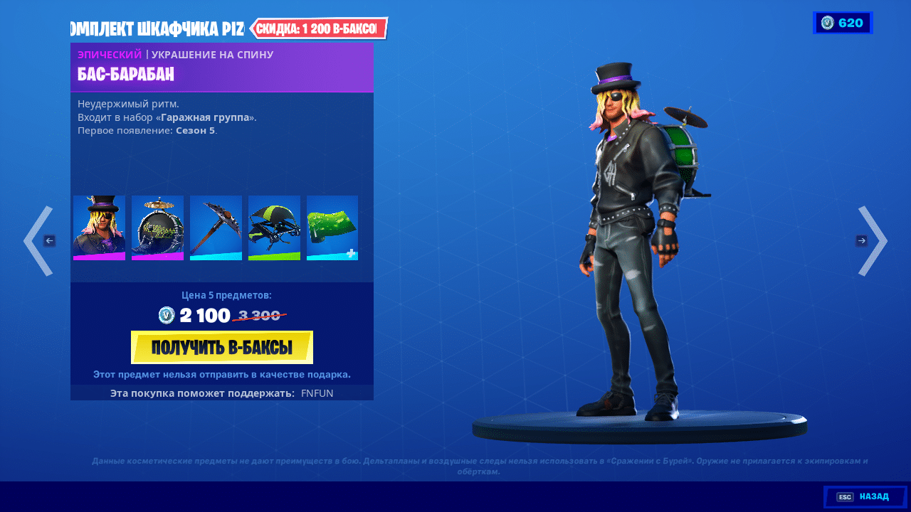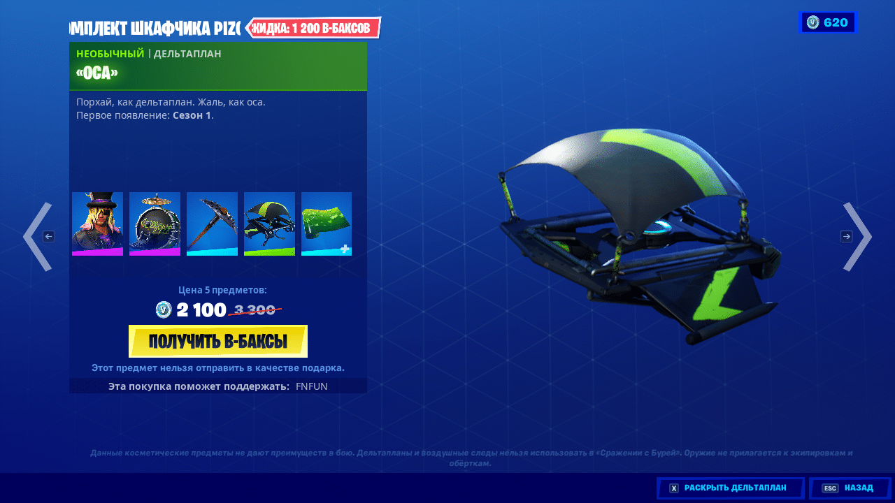 Его набор состоит из скина «Звезда сцены», дельтаплана «Оса», обертки «Токсичный всплеск» и кирки «Ежик». Полный набор обойдется вам в 2100 В-баксов, а если вы намерены покупать все предметы по отдельности (скин за 1500, дельтаплан за 500, обертка за 500, кирка за 800), то такое наполнение обойдется вам в 3300 В-баксов.