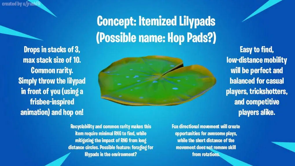 В это время пользователь реддита jrushFN придумал концепт Кувшинки. Создатель решил, что они будут обычным предметом для передвижения на небольшие расстояния. Они также бы сгодились для трикшотов. Кувшинки можно было бы бросать около себя как фрисби.