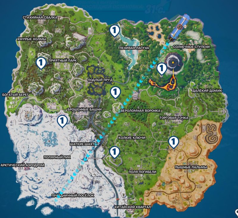 Ниже карта пушек прямиком из 2019 года. На удивление, никакие точки не изменились. Прилетаем в точку, залезаем внутрь пушки (для этого нужно подойти со стороны вылета пушечного снаряда и нажать действие). Выбираем угол в 45 градусов и стреляем.