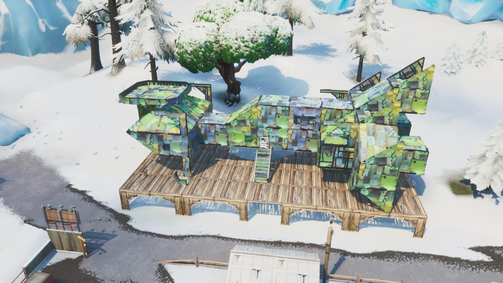 На сей раз нам необходимо надеть скин Веги (доступен только при получении 47 уровня бп) и отправиться в снежную даль к межгалактическому металлическому кораблю (если бы не испытание, я бы никогда не догадалась что это). Необходимая нам постройка с платой 19 находится южнее Шатких шахт и западнее Пика: