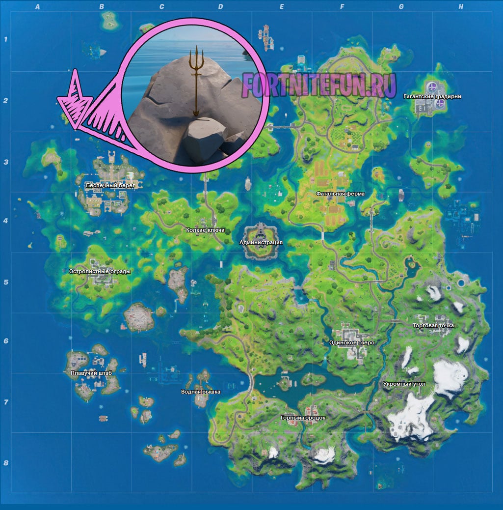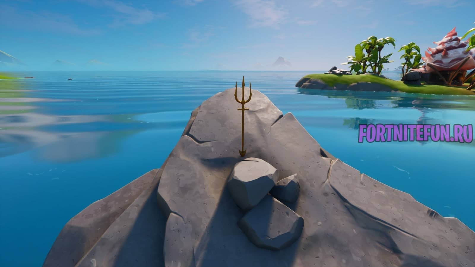 А точное место приземления у Вас сейчас на карте. Вам необходимо сесть на центральный камушек и именно на нем будет трезубец. Подойдите, обыщите его, зажав «Е», и задание выполнится.