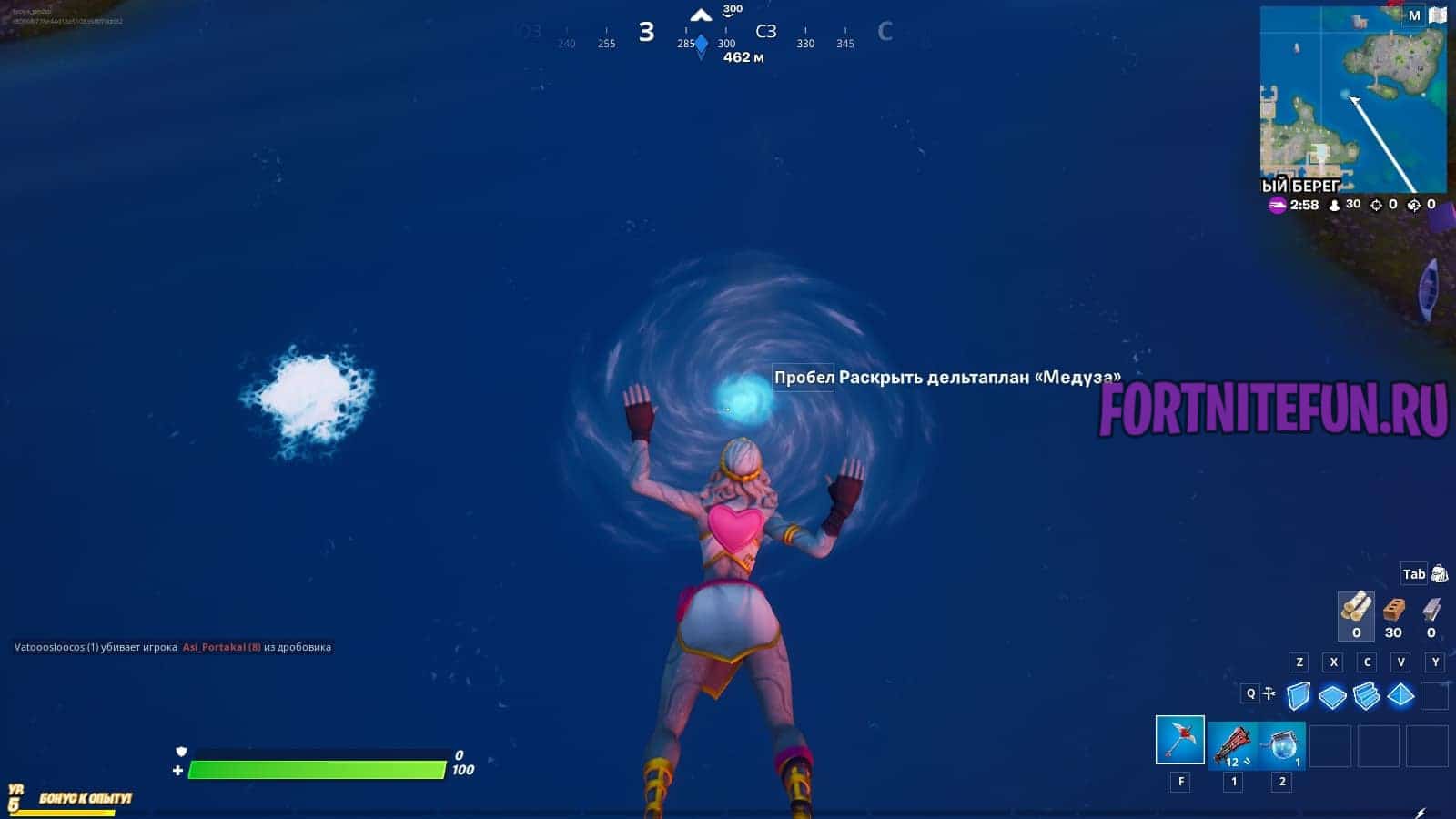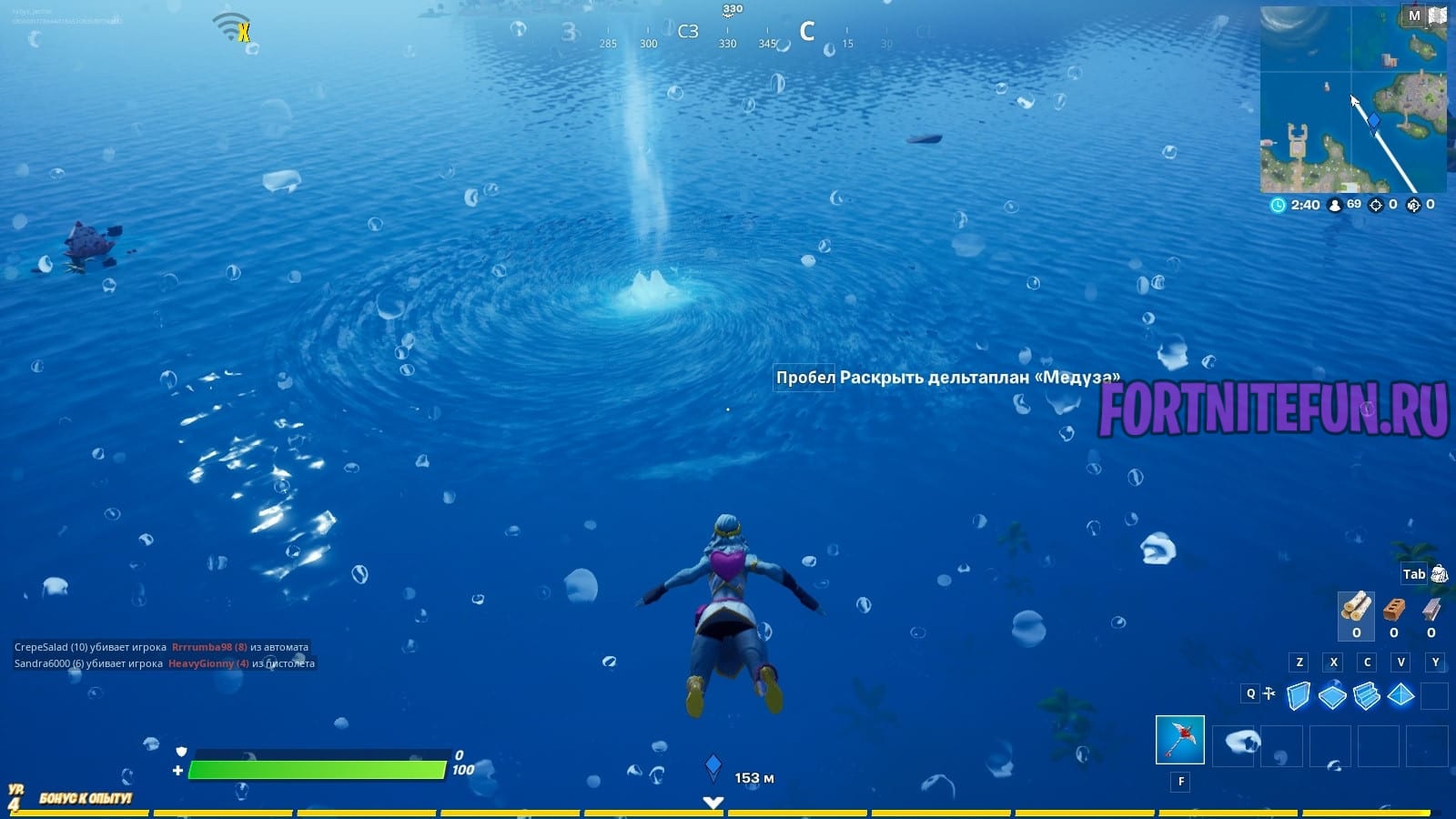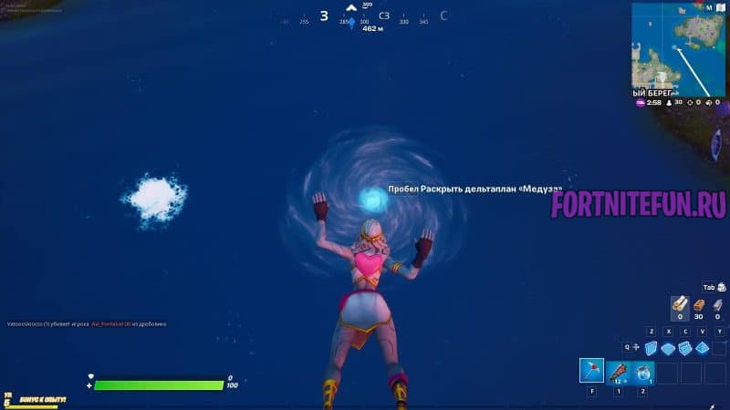 Водоворот фортнайт — это нам всем привычный гейзер, который располагается в воде. При попадании в него Ваш персонаж уходит на дно, а потом резко выпрыгивает. Используя водоворот, можно быстро сократить расстояние, потому что вам дают раскрыть дельтаплан.