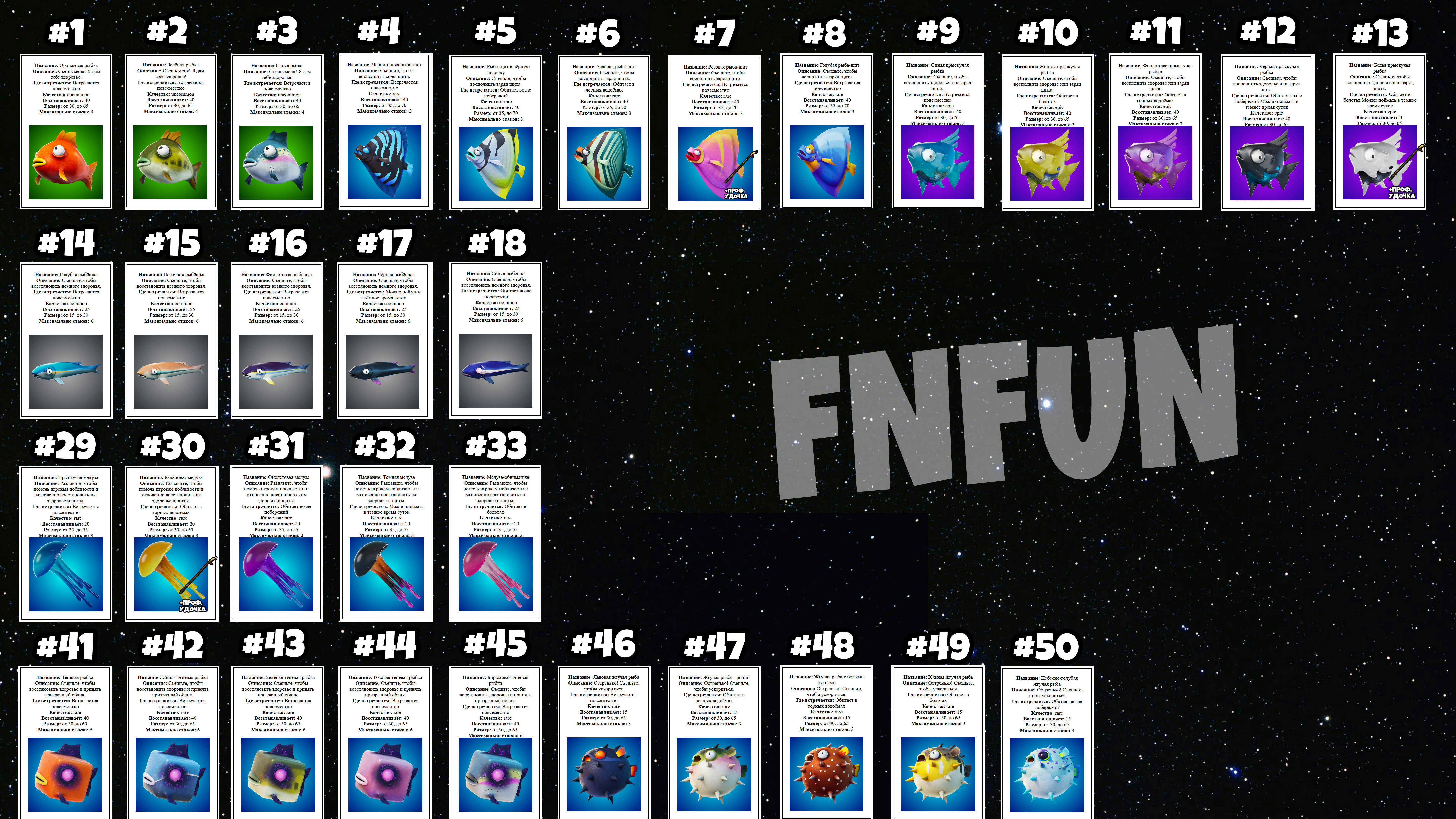 Сейчас перед вами все карточки рыб, которые можно выловить в игре. Картинка в высоком разрешении, ее можно приблизить и все будет видно.