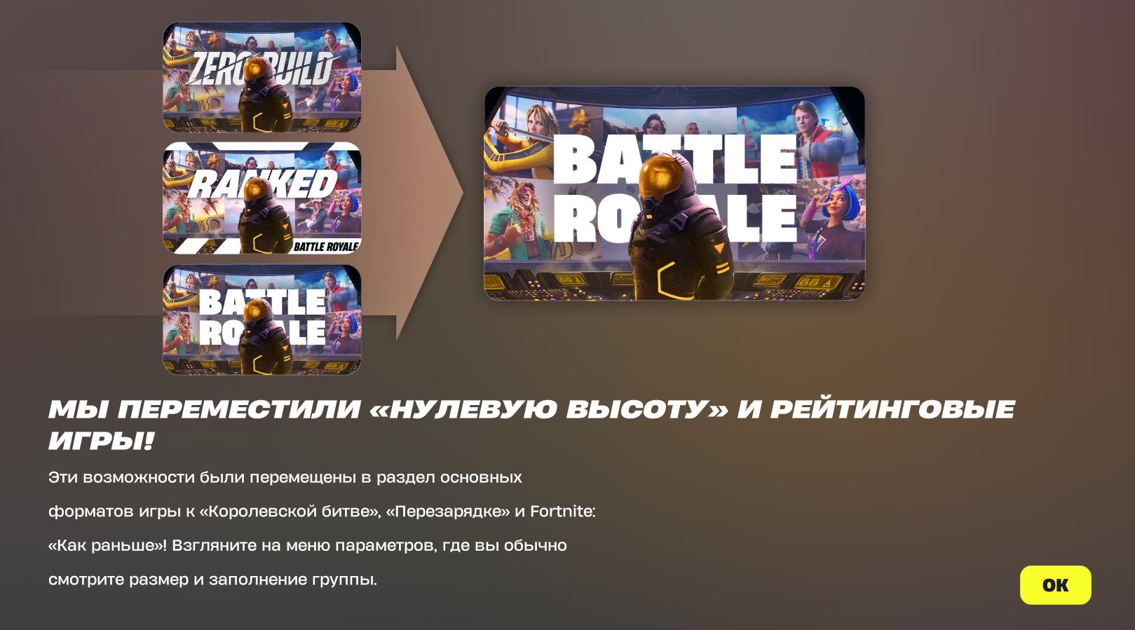 Фортнайт активно развивается и режимов становится всё больше и больше. В результате становится легко запутаться в поисках нужного режима. Теперь же вы выбрав нужный режим просто выбираете какие настройки должны быть для данного режима. Навигация становится удобнее и уменьшается число ошибочных запусков и долгих поисков.