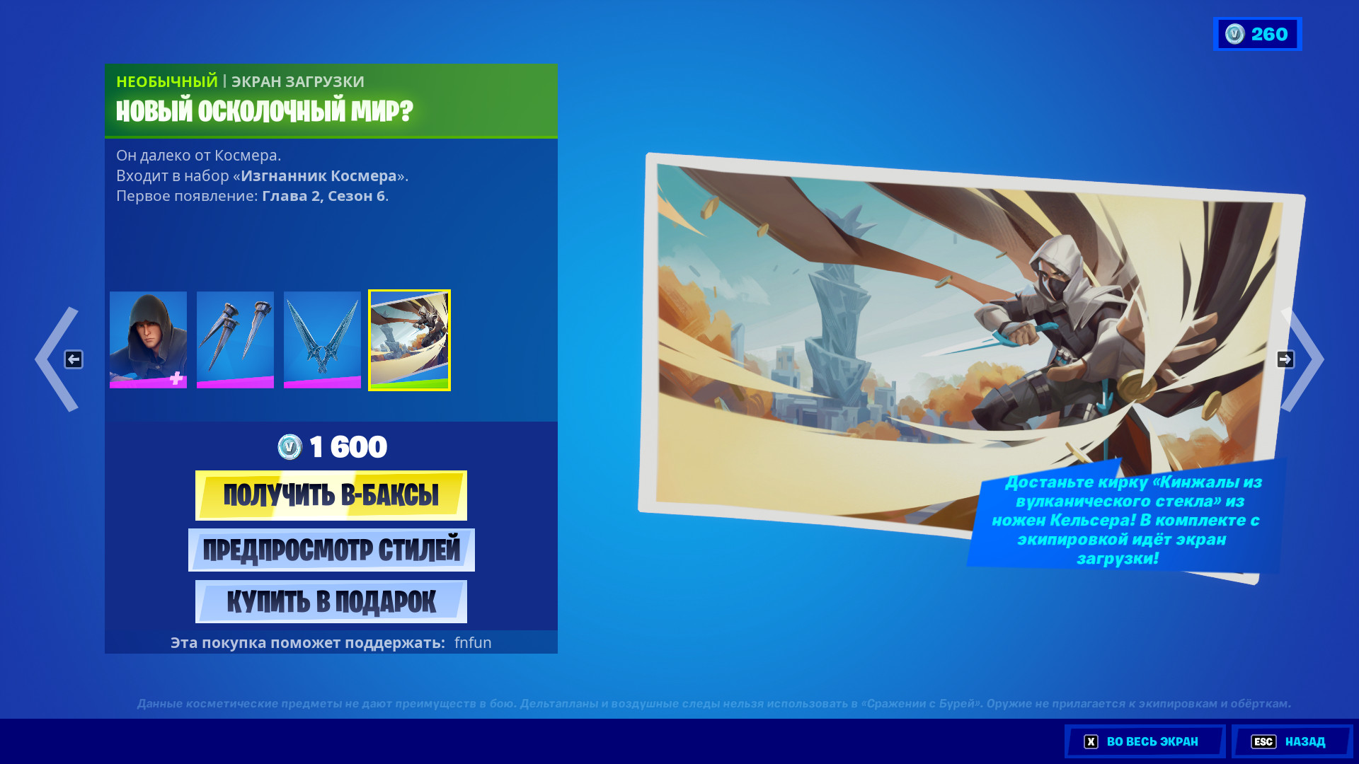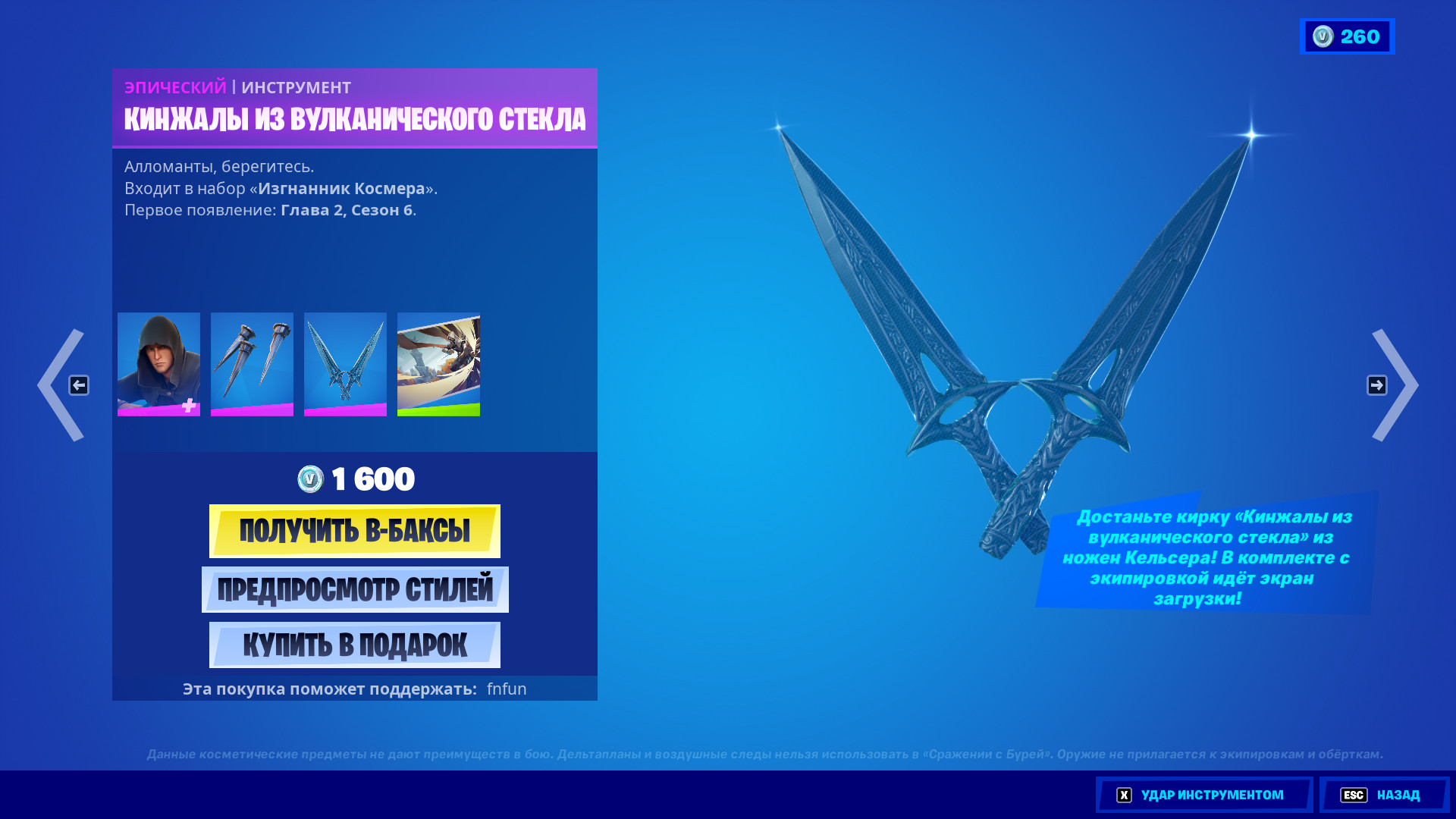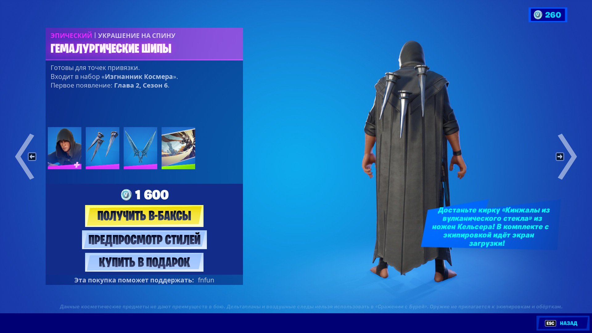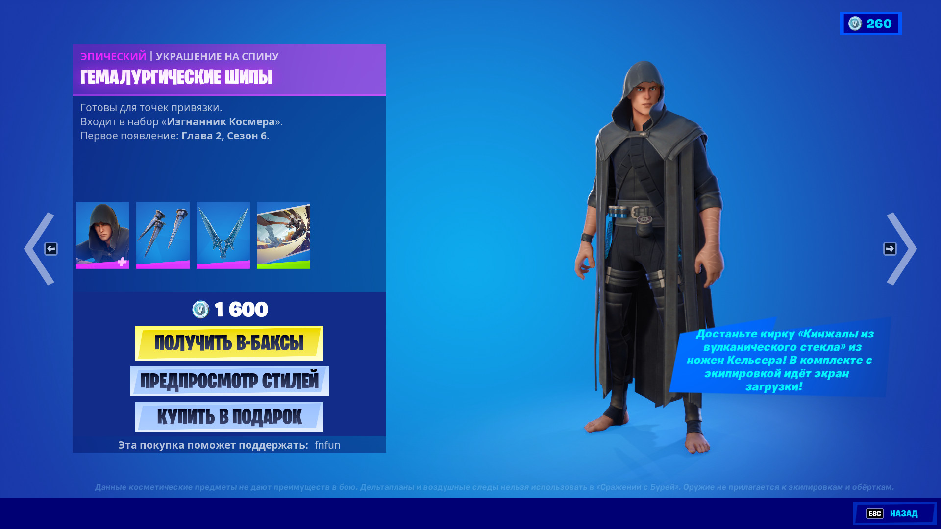 Купить все это великолепие можно только в наборе, стоимостью 1600 В-баксов. Если вы являетесь фанатом новеллы Mistborn, сообщите, как вам эти предметы, соответствуют ли они вашей фантазии? А просто фортнайтеров предлагаю высказаться касательного внешнего вида, будете покупать?