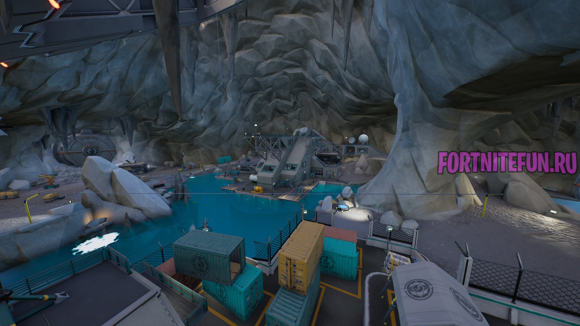 В Пещере полно сундуков, ящиков с боеприпасами, рыбы, ботов и врагов. Если вы любите трудности в начале игры, то вам сюда. В локации присутствует босс Костолом, с которым мы сражались в прошлом сезоне. С него можно получить мифический пистолет пулемет «жало».