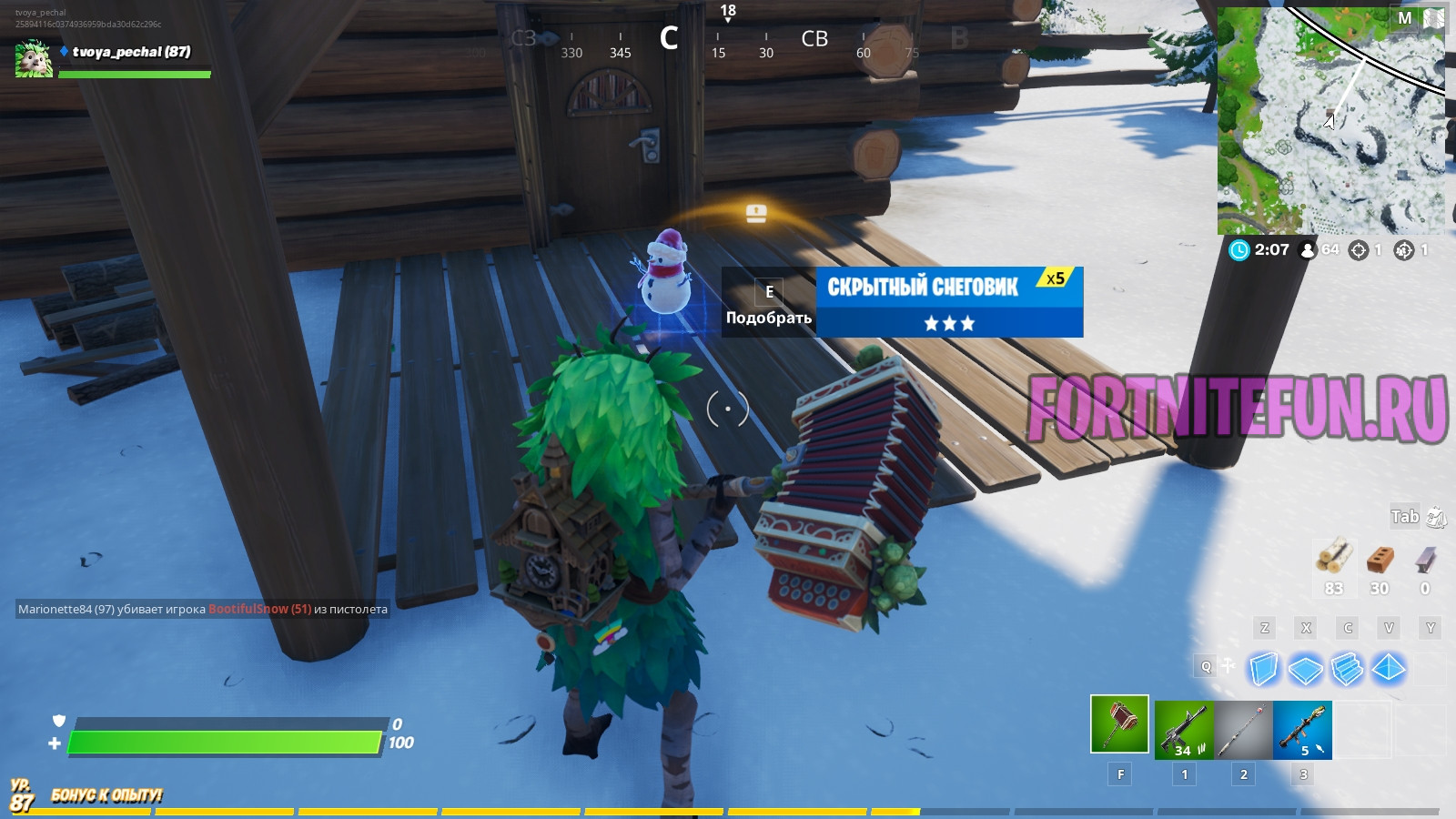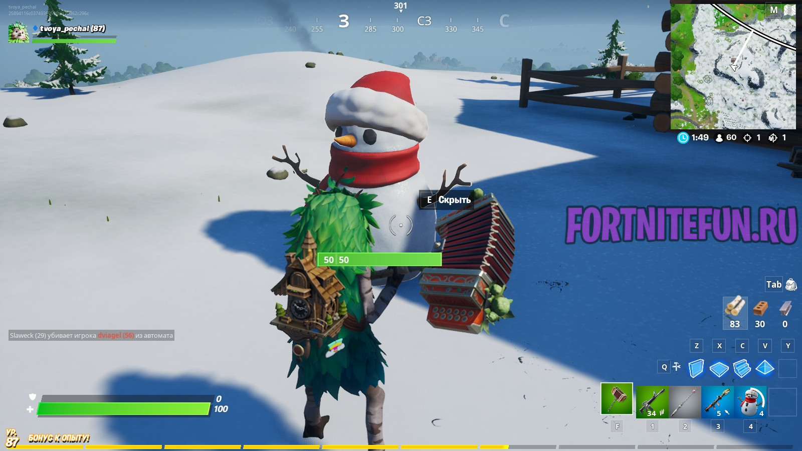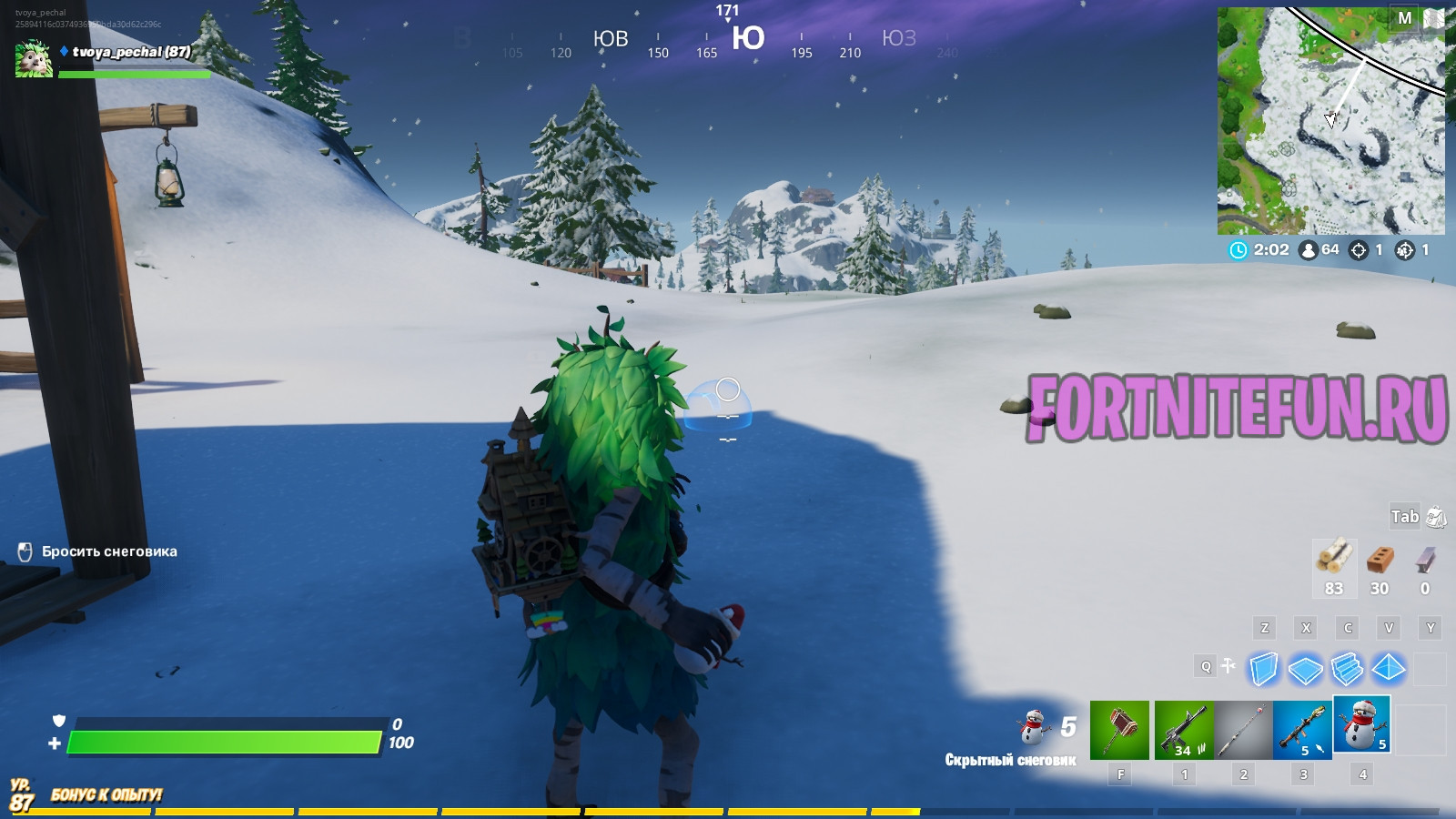 Скрытный снеговик фортнайт — это и предмет, и атрибут улиц игры. Снеговик как предмет прячется во всех возможных местах, наиболее частое место встречи — пол. Поднимается как обычный предмет, имеет 5 зарядов и кидается на приличное расстояние. Чтобы спрятаться в нем, для начала найдите снеговик, киньте его, подойдите и нажмите на «Е».