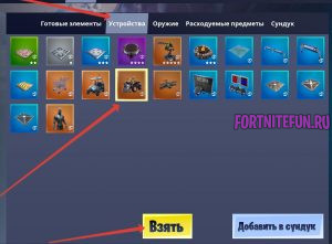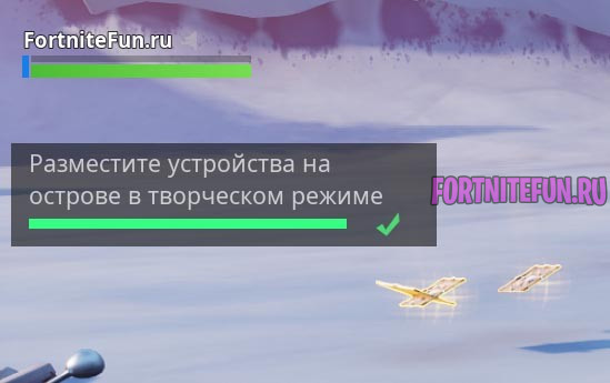 13 испытание серии челленджей «14 дней Фортнайт«. Сегодня наша задача — зайти в творческий режим ( его можно выбрать и в меню запуска, и при выборе режимов), попасть на остров ( есть порталы до основного острова) и выбрать любое доступное устройство из инвентаря (нажать TAB, выбрать устройство и разместить).