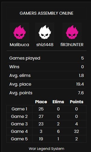 Самый лучший результат показало трио: Malibuca, shizoname, fiR3hUNTER. Они занимают 18 строчку с 38 поинтами. Первые две игры они проиграли в 0 поинтов, 3 тоже не задалась. 4 игра оказалась самой лучшей, трио набрало 32 поинта и заняло хорошее место. Они заняли 18 строчку, а призовые места начинаются с 5 места.