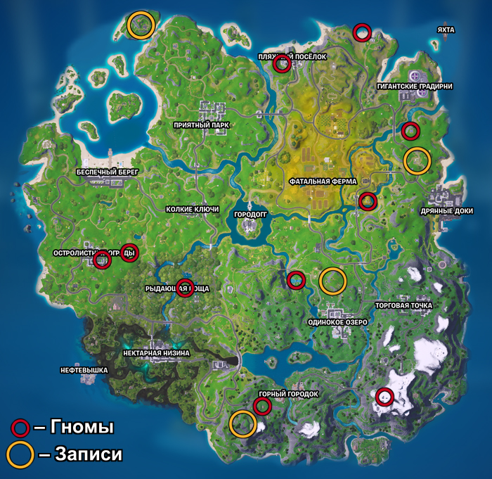 А чтобы не бегать по всему острову, уворачиваясь от града пуль, в поисках маленьких гномов, ниже представлена карта со всеми секретами (на момент первой недели). Они будут помечены особой иконкой, когда вы подойдете к ним достаточно близко.