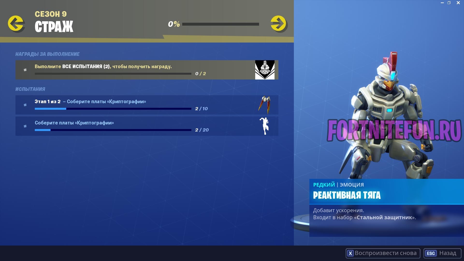 У всех скинов 9 сезона есть свои стильные испытания и Страж не исключение. Для прохождения этих испытаний воспользуйтесь нашей статьёй о прохождение Криптографии фортнайт, а в награду вы можете получить эмоцию «Реактивная тяга» и украшение на спину «Крылышки».