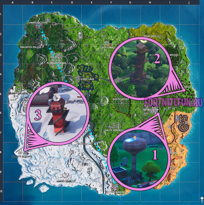 5 неделя 7 сезона не могла обойтись без серии «танцуйте на». Несложное задание, если знать точное расположение необходимых точек. Следуйте нашей карте, приземляйтесь в указанные районы, жмите «B» и танцуйте: