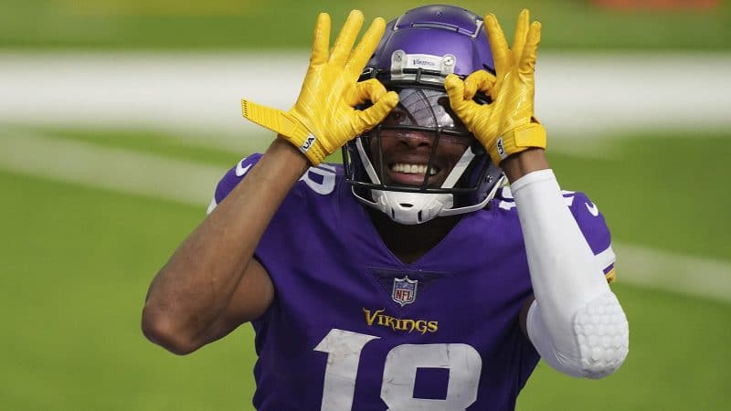 - Minnesota Vikings wide receiver Justin Jefferson (18) celebrates after scoring his first NFL touchdown in the third quarter of a football game against the Tennessee Titans, Sunday, Sept. 27, 2020, in Minneapolis. (Anthony Souffle/Star Tribune via AP)